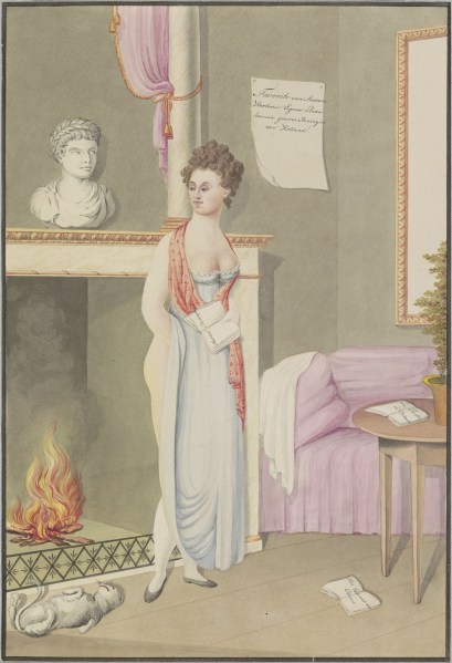 She’s fondling herself and baring her bottom to a fireplace while reading a book: Hortense de Beauharnais, Queen Consort of Holland is shown in a bad light here. The book in her hand is labelled “Thérèse philosophe”; on the table lies “La Pucelle d’Orléans” and thrown on the floor is “Het Cabinet der Dames”(*) –…